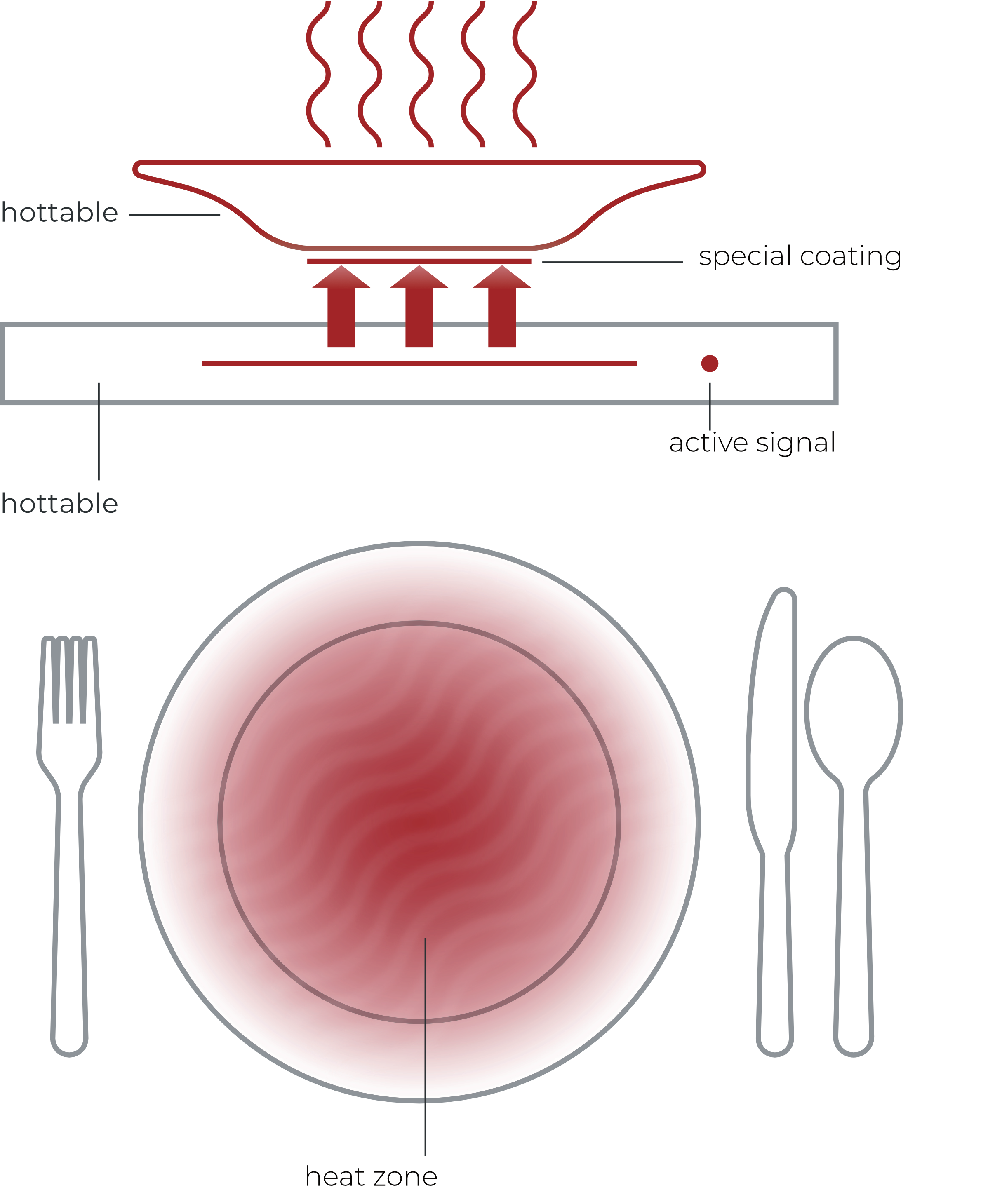 The hotplate1 warming technology can also be individually integrated into wood, plastic, or glass tables of different shapes and sizes. Likewise, the dinner plates can be produced in a variety of designs with the special coating.